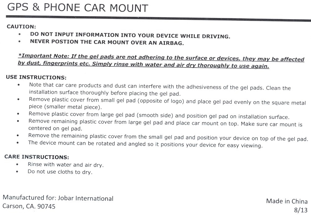 Jobar GPS & Phone Car Mount Model JB7050 (285 KB, 1 page)