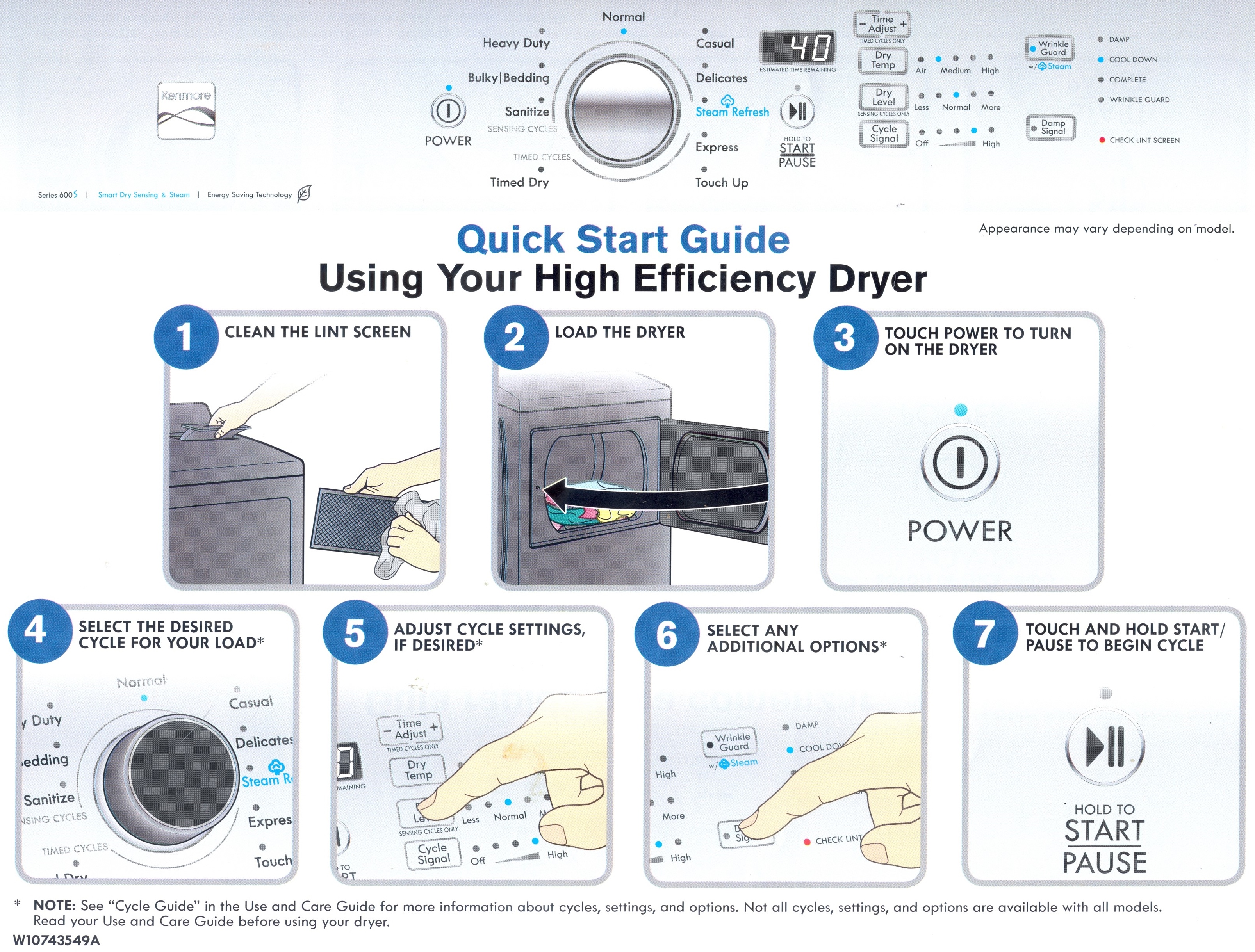 Kenmore Dryer Models 110.66132410 and 110.67132410 Quick Start (3.1 MB, 1 page)